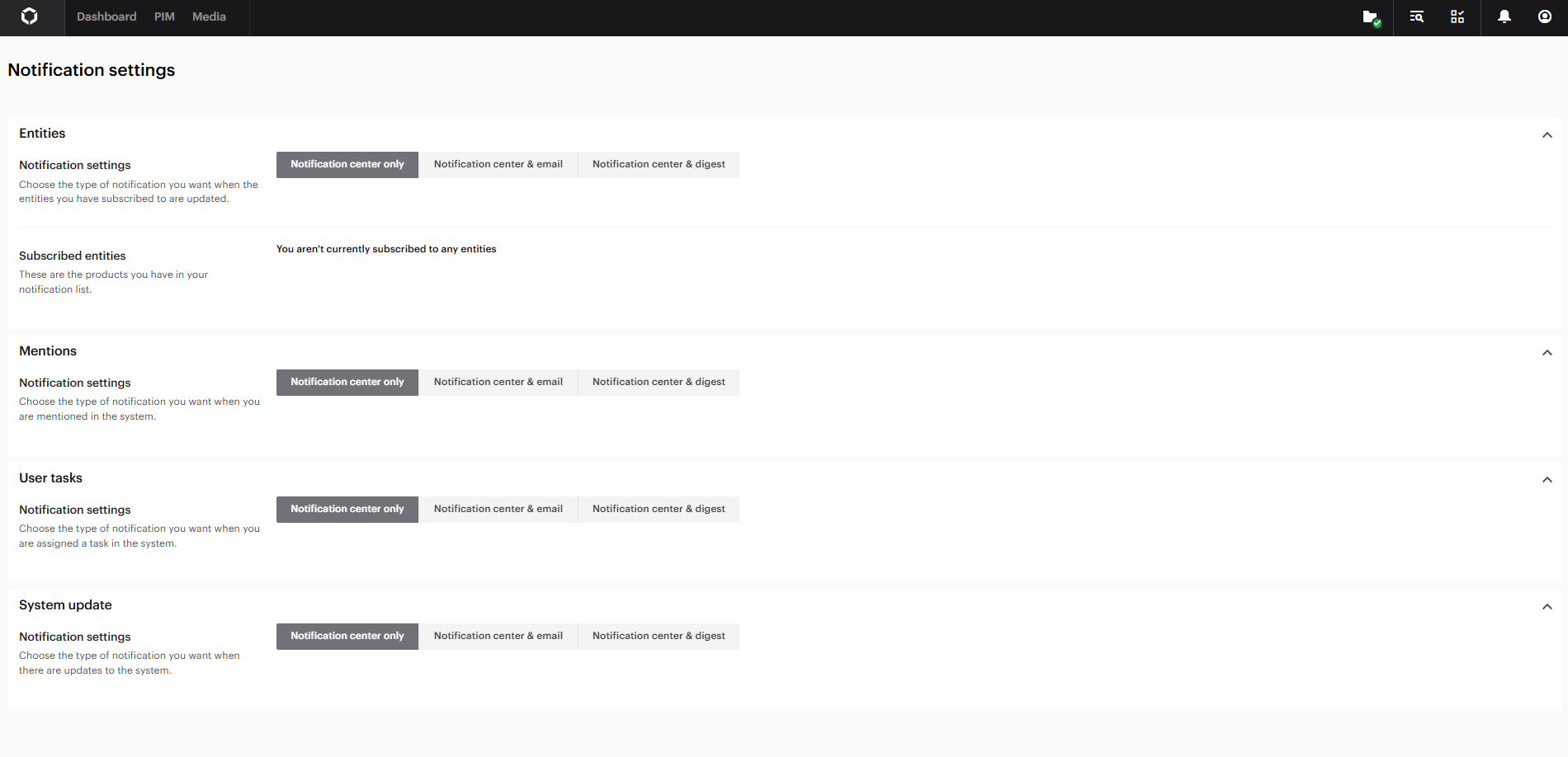From the Notifications settings page you can specify where you want to be notified based on changes in the PIM. By default it is set to "Notification center only", but can be changed so that you also will be notified by email or via digest.
