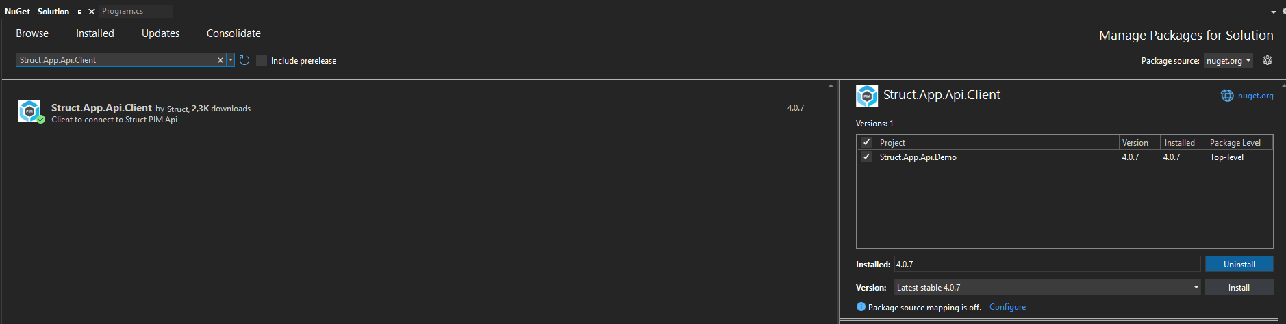 Or go to 'Tools' > 'NuGet Package Manager' > 'Manage NuGet Packages for Solution'. In the NuGet Package Manager, click on 'Browse', search for `Struct.App.Api.Client`, and install the latest version.
